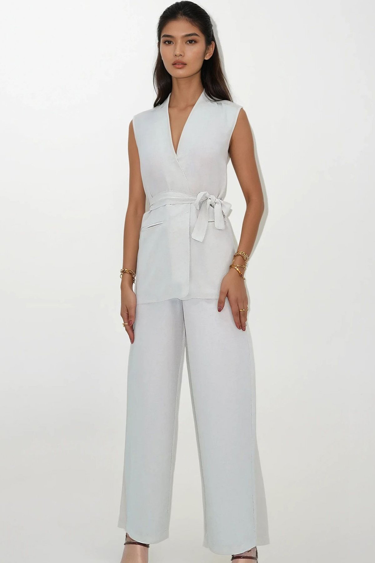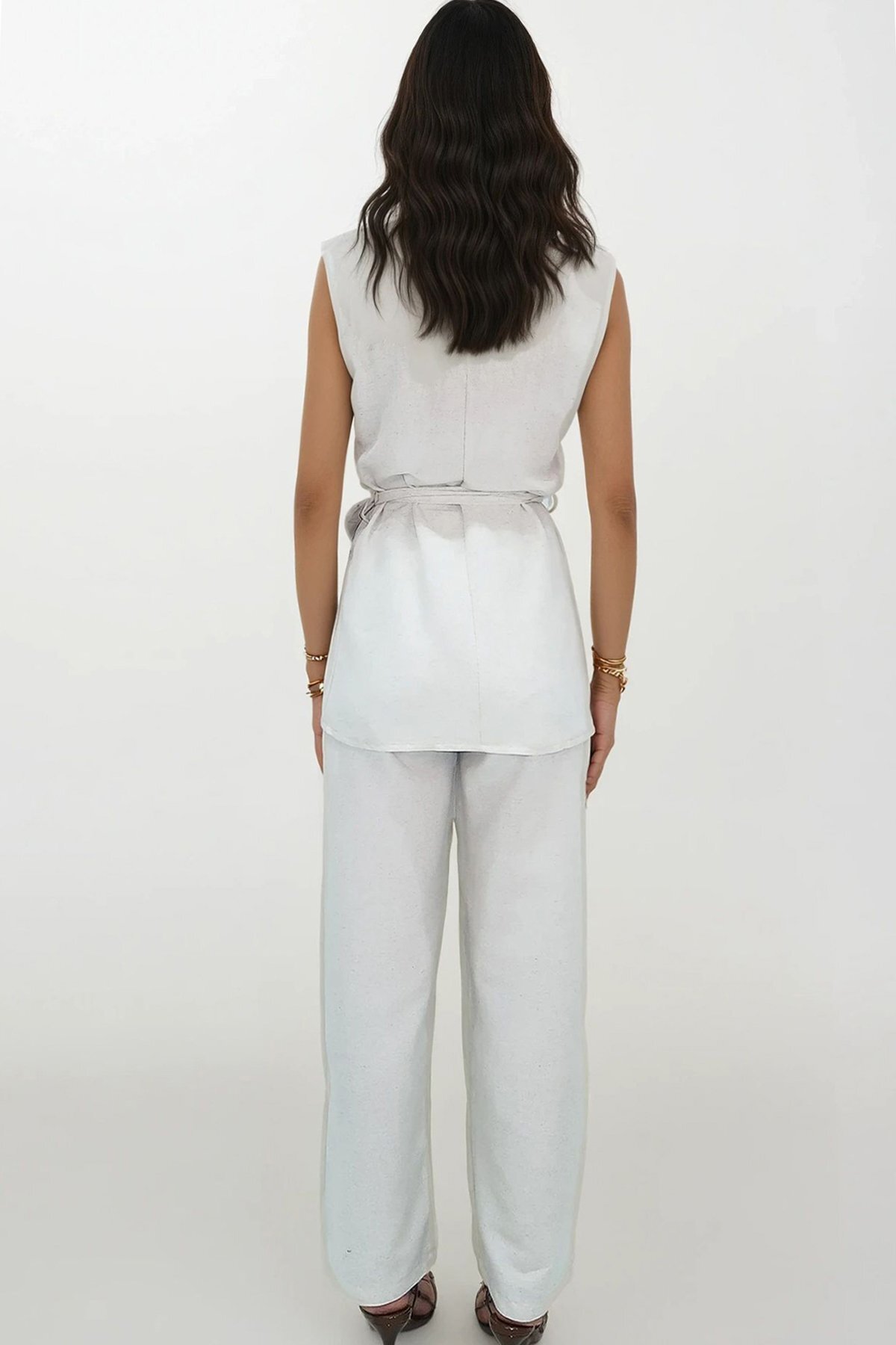 Göz Alıcı Tasarımıyla ÇiFt Cepli Bağlamali Keten Pantolon Yelek Takım, Özgün Stilinizi Yansıtır.